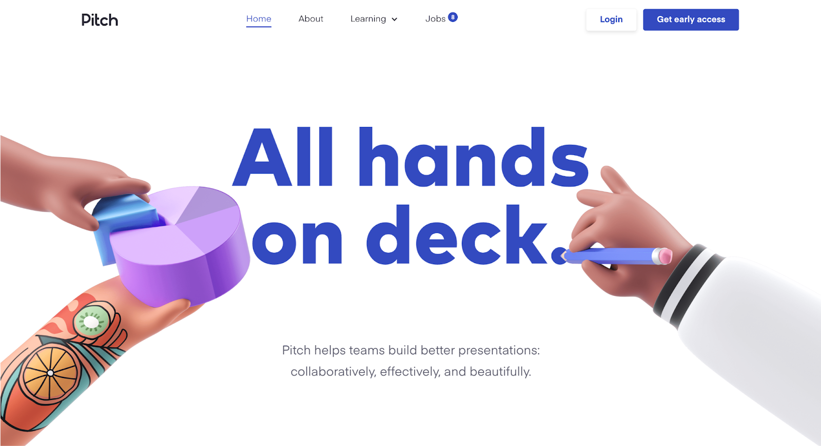 Bjorn continues to showcase Pitch’s messaging by infusing it within the website’s design language. Next to a header reading “Formatting that’s effortless,” a cartoon hand snaps as you scroll by, suggesting that using Pitch is a “snap” — simple and quick.