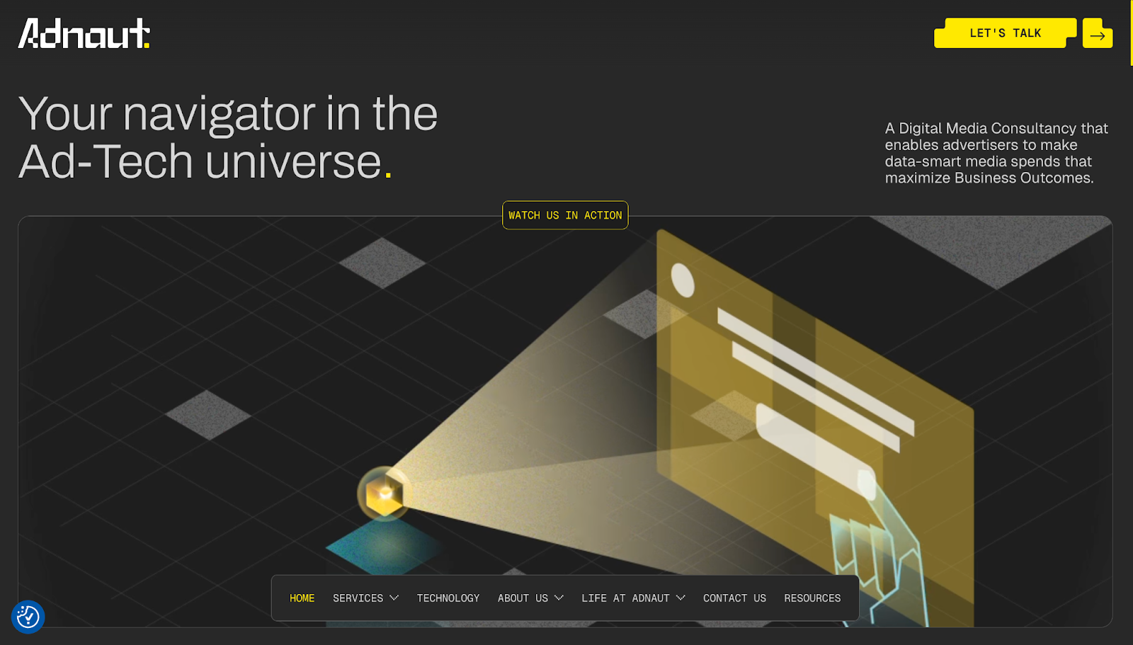 Adnaut’s site, designed by Everything Flow, has space-themed microinteractions, making its ad-tech story feel fun and exciting. The hero section uses a robot-like animation with a “Watch us in action” prompt, tying the CTA to the on-screen visuals.