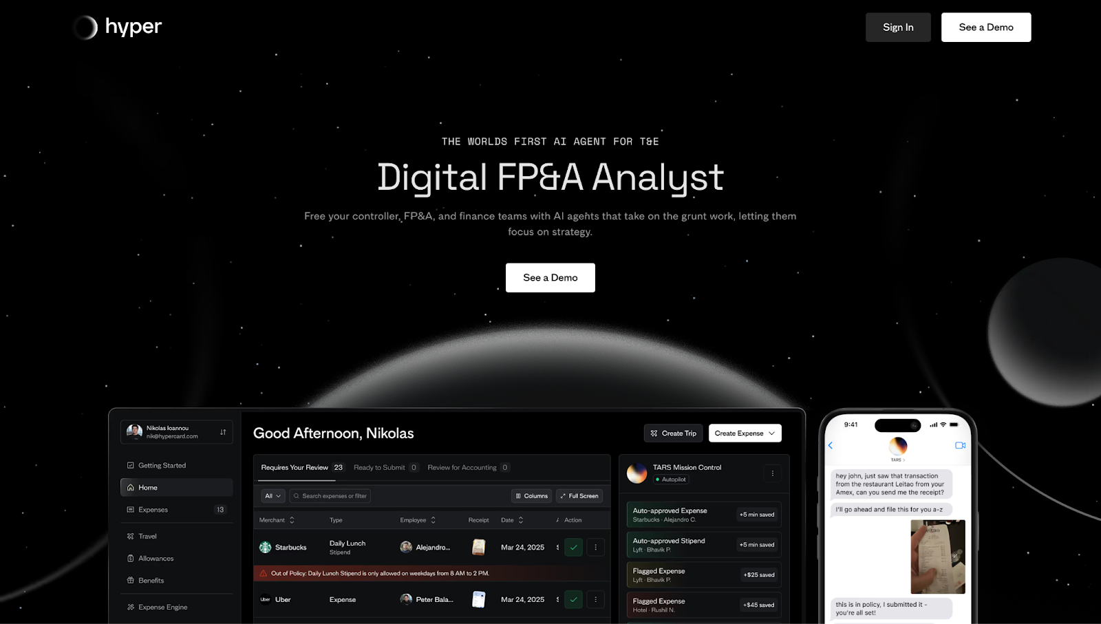 The webpage details Hyper’s specific tools and features throughout the page. The bottom of the page has a set sticky menu with “Schedule a demo” and “Get started” CTAs, making conversions accessible at any point.