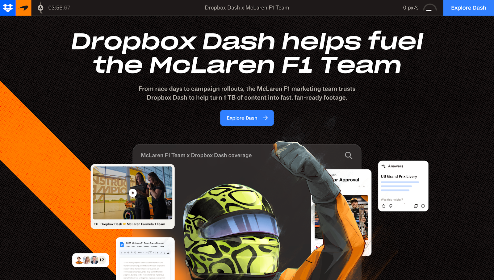 Dropbox Dash x McLaren’s case study-style one-page design combines high-octane visuals, thematically appropriate copy, and narrative storytelling to emphasize the collaboration with McLaren’s Formula One racing team. The site uses moving UI cards and scroll-triggered animations to showcase the marketing team’s creative approaches to specific and unique digital assets. And, mirroring their client’s identity, the site prioritizes performance and speed.
