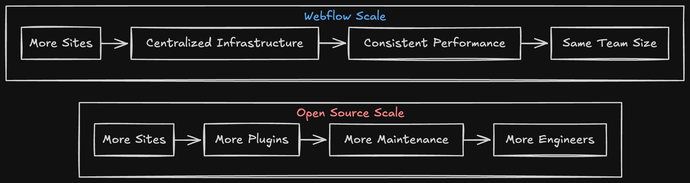 Open source CMSs don’t scale through automation, they scale through people, more engineers, more maintenance, more risk. Webflow scales through infrastructure.