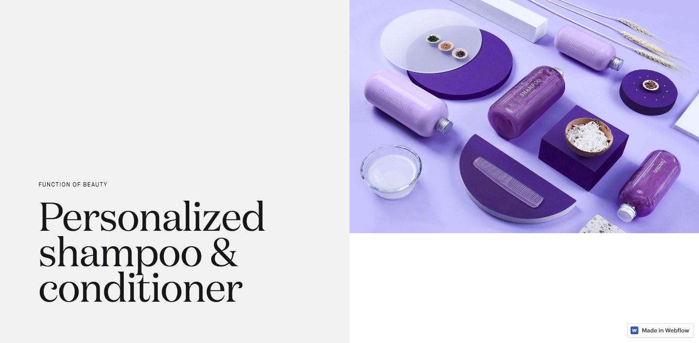 Shampoos and conditioners are laid out with other ingredients in well-composed shots. Most of the design’s color comes from these photos, which also occupy most of the design space. None of their products ever get lost in the text, with a constant visual presence throughout. With great photography combined with offset blocks of content and subtle animations, it makes for a colorful and easy way to navigate this showcase of their hair care products.