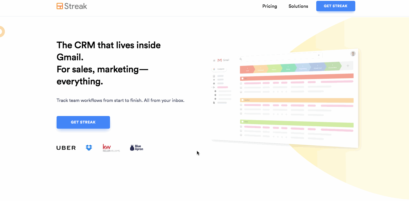 Streak is a CRM tool that integrates with Gmail. And it was surprising to me that the leader in CRM (who will remain nameless here) has a website that’s as visually exciting as a flyer left on your front door. But their reputation is so good they don’t need to put a lot of effort into their design. Streak stands out with a creative and modern design.