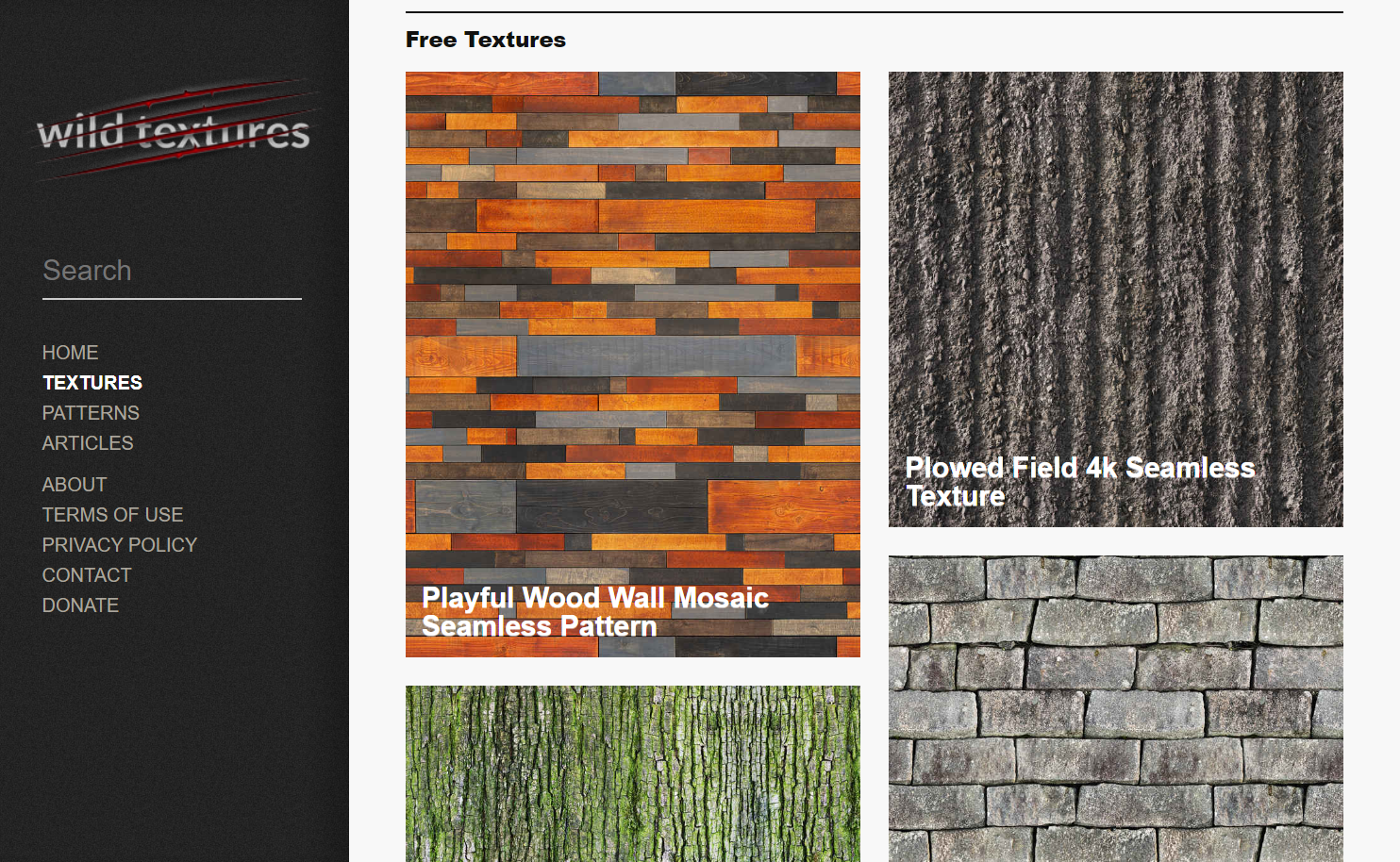 If your aim is to create an almost tactile user experience, browse Wild Textures. They offer an evocative collection of patterns that add a real-world feel to any site. Their wallpapers include natural finishes like stone, tree bark, and greenery, plus high-resolution photos of metal, glass, creased paper, tile patterns, and grunge patterns like peeling paint and dirty walls.