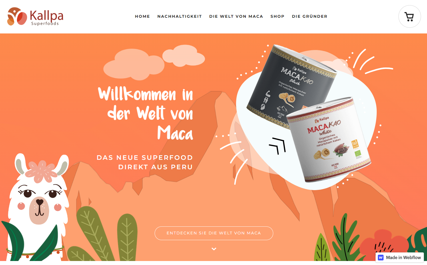 Kallpa Superfoods site designer Magni & Tude added loads of personality to the Kallpa Superfoods site by using animated and interactive elements in their unique background pattern. Clouds roll across the screen on the landing page, a map of South America zooms in to explain where the products are from, and alpacas pop up and bob back down again as you scroll down through the site.