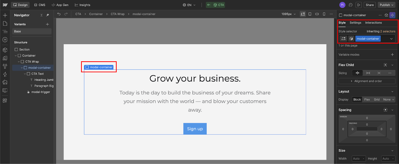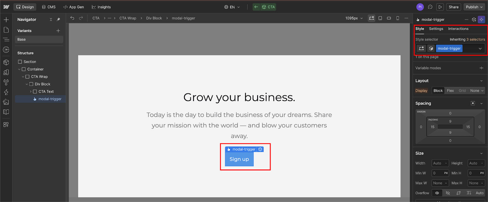 Open your Webflow Designer and select the element that triggers your modal (usually a button or link). In the Settings panel, add a class name like modal-trigger.