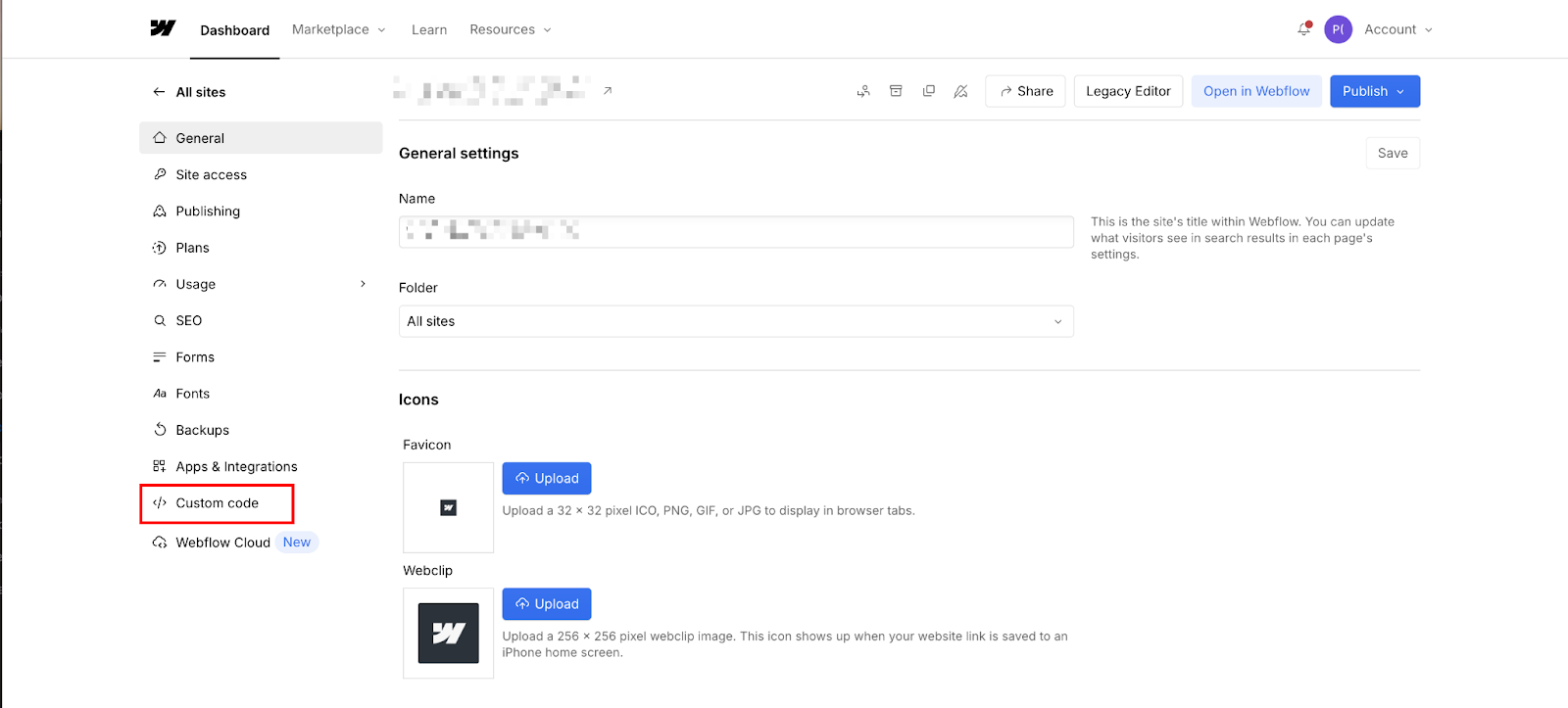 Click the project settings icon in the left sidebar (gear icon), then select the "Custom code" tab.