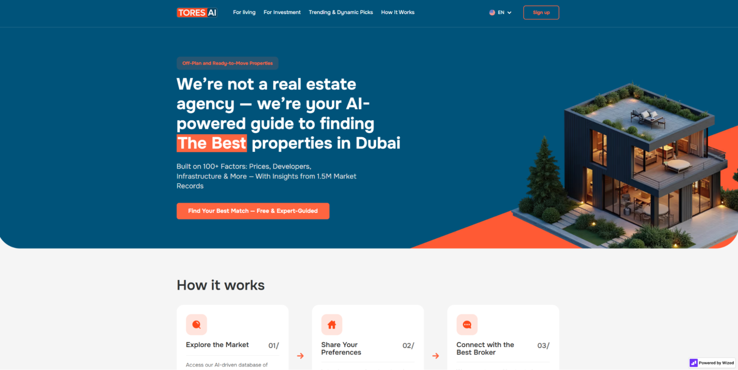 Top Real Estate is an AI-powered database of property listings in Dubai that connects investors with properties and brokerages. Their AI matchmaking differentiates them from traditional realty sites, and their website makes that fact clear in the headline and the “How it works” section that follows. Visitors must scroll through the instructions to reach the filterable property search database, so they know how to navigate the site before trying to use it.