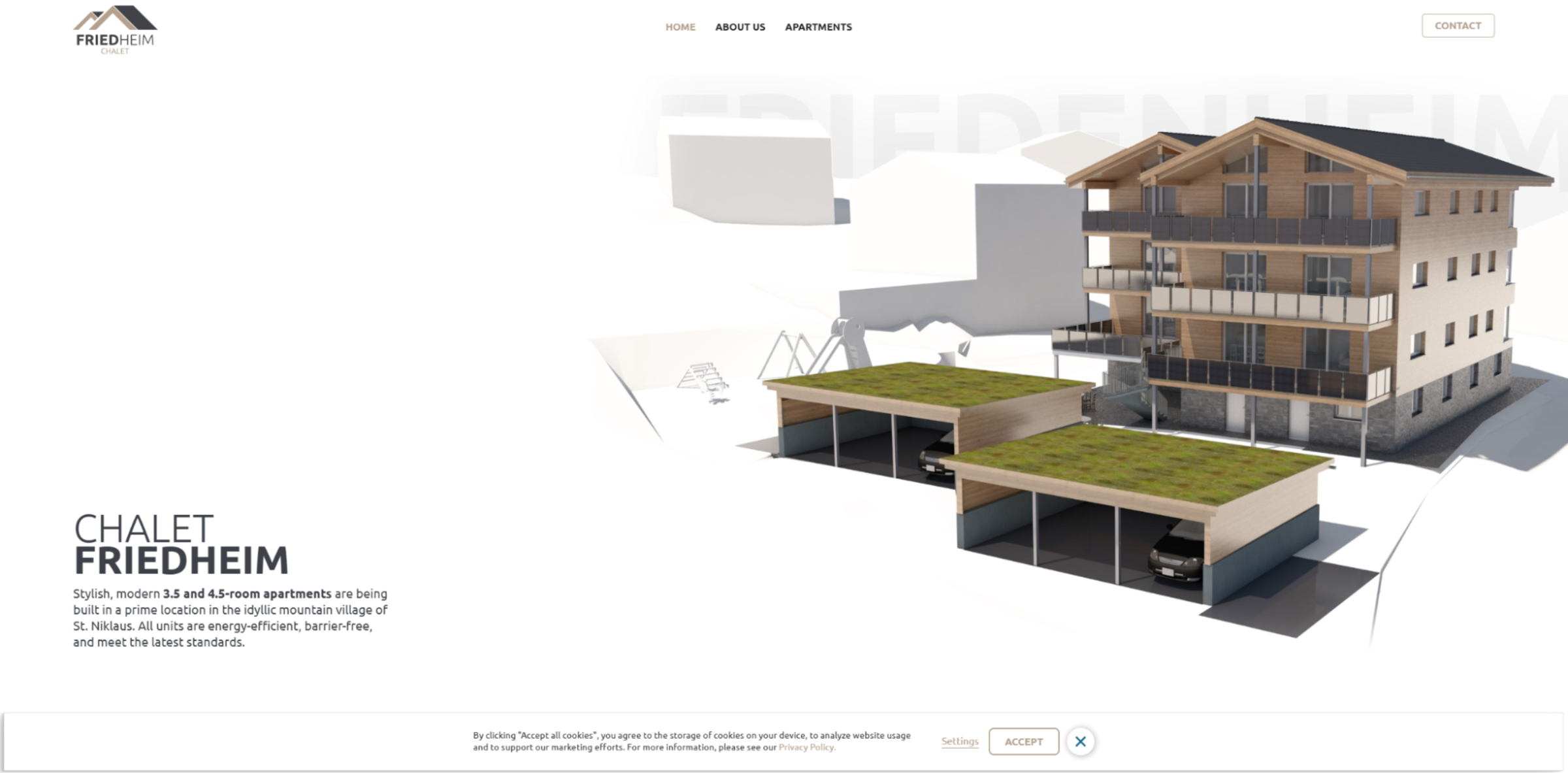 The Chalet Friedheim project is reinvigorating the traditional Swiss village of Zaniglas with new affordable housing that offers generous space and luxury amenities. The site, designed by Bravenex, spotlights all their work by immediately showcasing the building plans and amenities on the homepage. This is an especially smart strategy for a real estate company who focuses on pre-construction sales. With the right visuals and detailed descriptions, they can get buy-in from interested investors long before the project crosses the finish line.