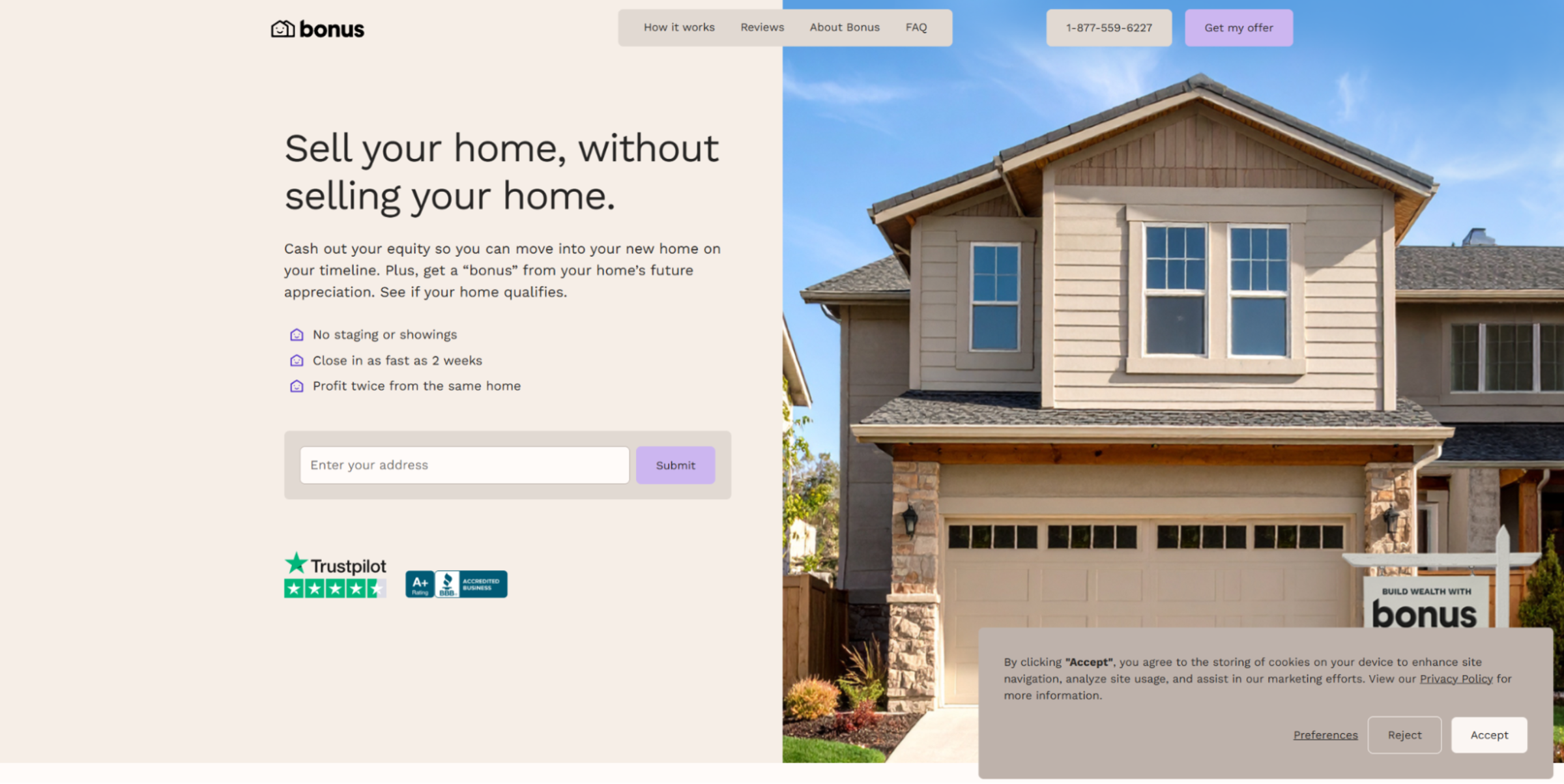 Bonus Homes allows homeowners to cash out their current equity and earn a share of their home's future value. Like other alternative real estate solutions, their website doesn’t feature property listings or spotlight real estate agents. Instead, it focuses on establishing that their unusual proposition works with reviews, certifications, and even a video from their very first customer. It serves as a great example of using social proof to build customer trust, especially for new finance-focused real estate companies.