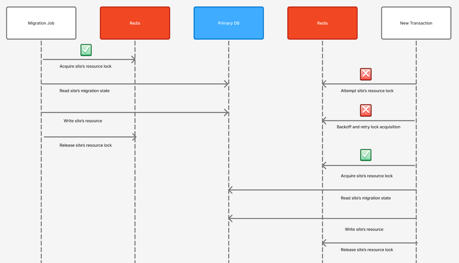 While migrations were in flight, there was a risk of race conditions if another client attempted to write to the same non-sharded documents. Without proper coordination, this could result in data corruption or inconsistent state between competing transactions. To address this, we implemented a Redis-backed locking mechanism to guarantee data consistency. The first write operation acquires the lock, and subsequent writes block until the lock is released. Lock scope was intentionally narrow, covering only the operations required to read migration state metadata and write the corresponding resource data.