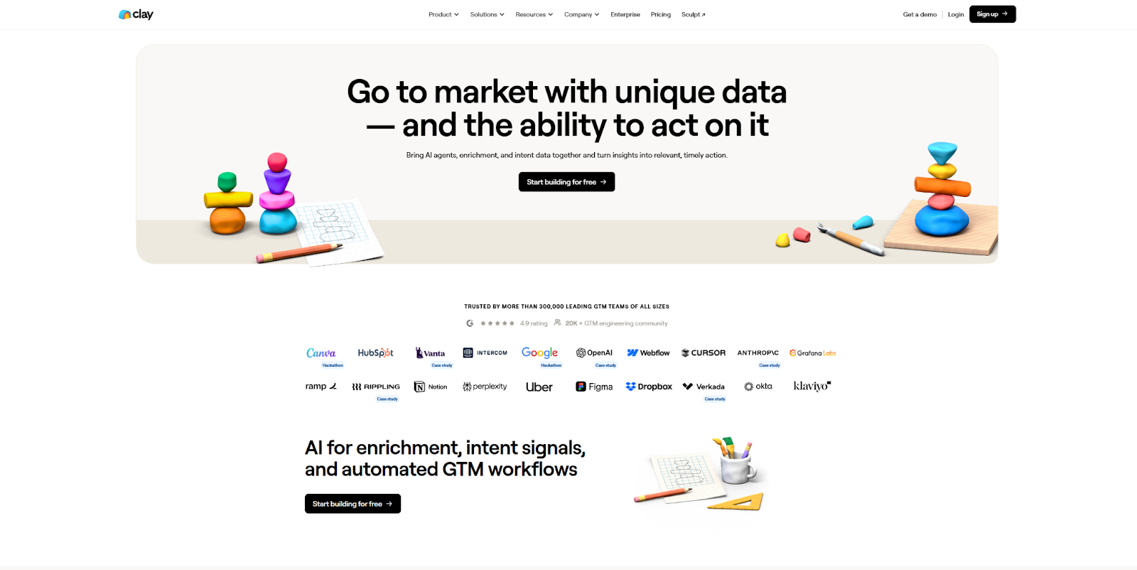 Clay’s web design is a good example of how you can use social proof to build trust with your target audience. The first row below the hero image is a large list of well-known businesses that use this startup's product. Every row after that dives into a case study for one of those clients, showcasing how Clay’s service benefitted each client. The site is highly informative, and every element works to highlight Clay’s credibility and effectiveness.