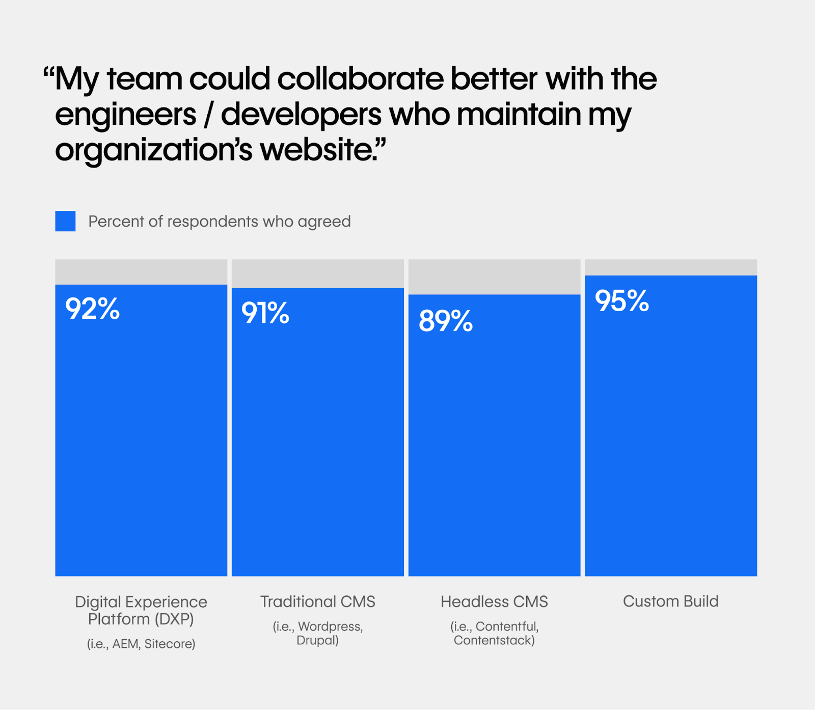 Lack of ownership is another pain point shared among marketing leaders at leading enterprises. Traditional web development systems place marketers and developers in separate silos, and subsequently marketers don’t have enough control over the website. 81% of survey respondents shared that their work is restricted by engineers or other teams and 36% said that their teams want to have full ownership over their website, but don’t. It’s also clear that collaborating with these silos in place is a major challenge, one exacerbated by the web tools many of today’s teams are using.