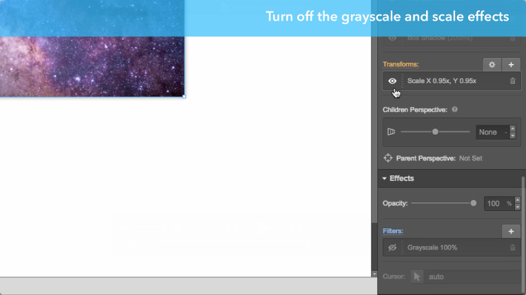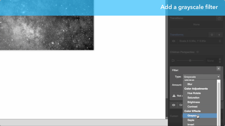 Scroll down to the Effects section of the Style tab. In the filters section, click the plus button to add a new filter, then select “grayscale.” This will make the image black-and-white by default, and we’ll bring the color back on hover.