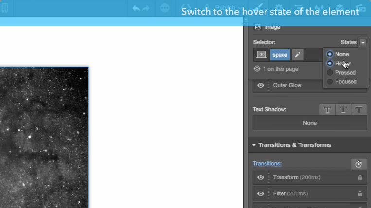 Select your image (or whichever element you would like to give this interaction to), then scroll down to the Shadows section of the Style tab. In my example, I set the outer glow to black with an opacity of 50%, with a blur of 10px to give the element some depth.