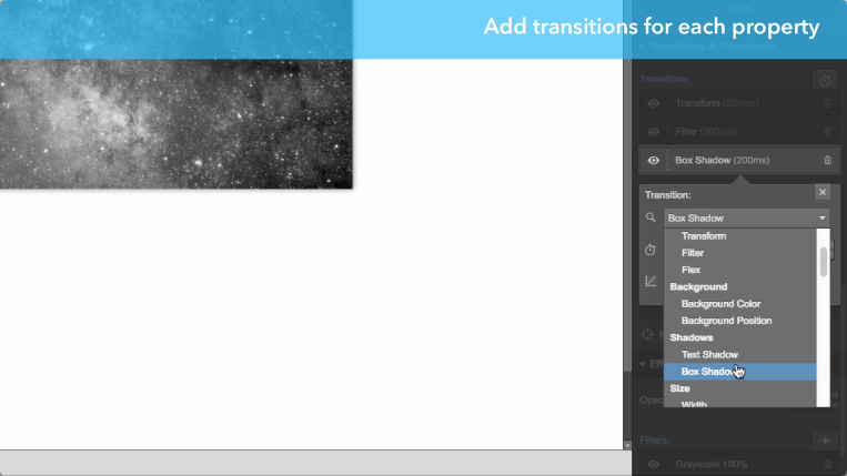 Now scroll back up the Styles tab till you reach the Transitions & Transforms section. Add a transition timer for each property you just added: