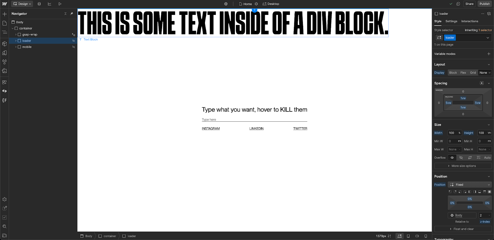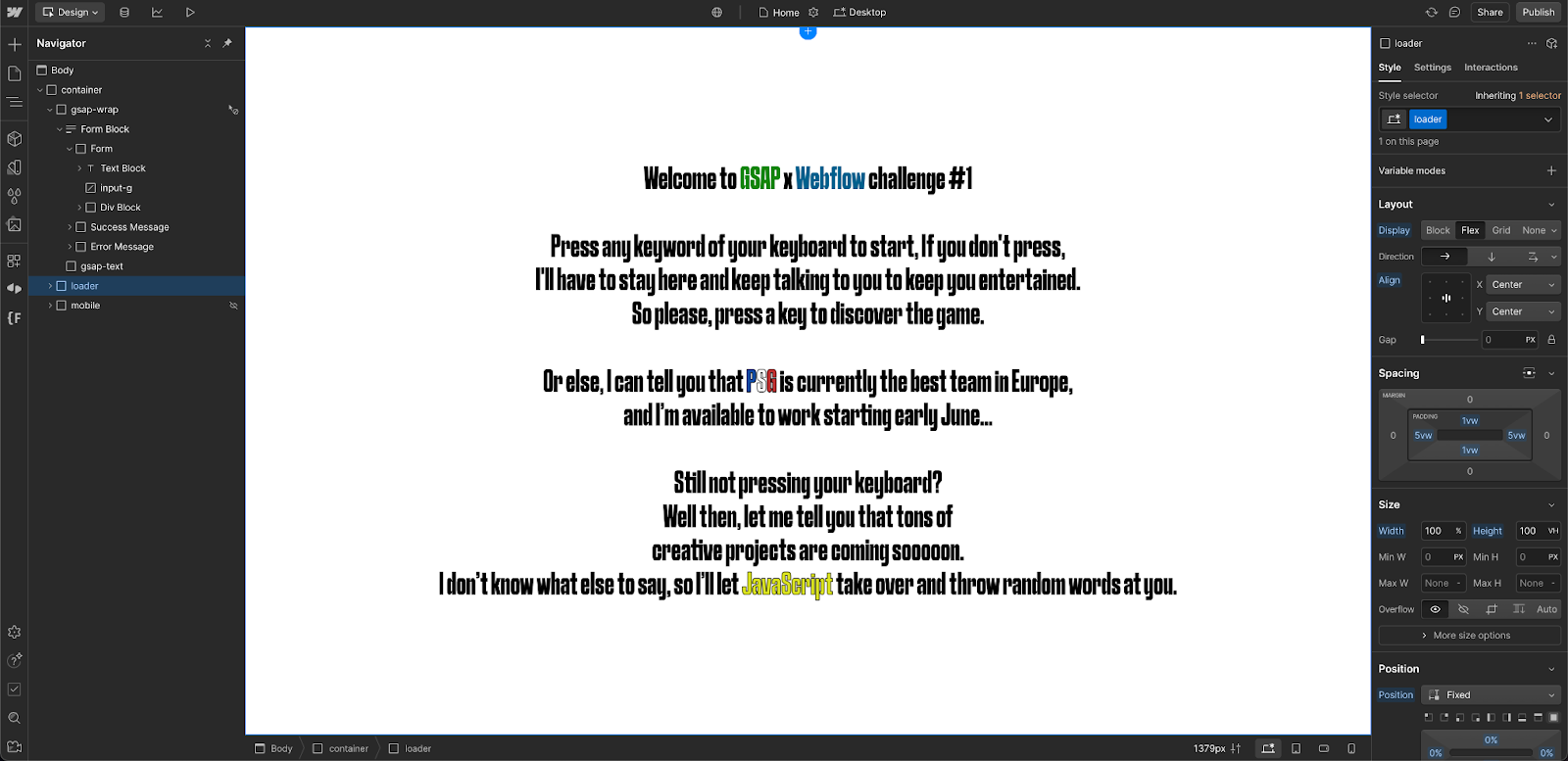 When approaching the challenge, Thomas focused on GSAP's SplitText feature in a new creative direction. To make this come to life, he built the full structure and styling in Webflow over the course of a single day, and added a loader to guide users through the experience.