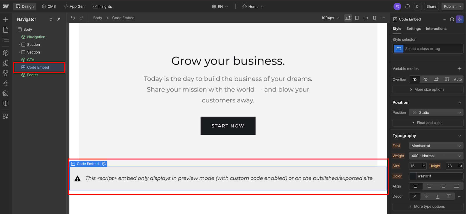 In your Webflow Designer, decide where to place the modal initialization code. This code has no visual output, so placement doesn't affect the design, but the convention is to put it near the page footer so it loads after your button elements have been added to the DOM.