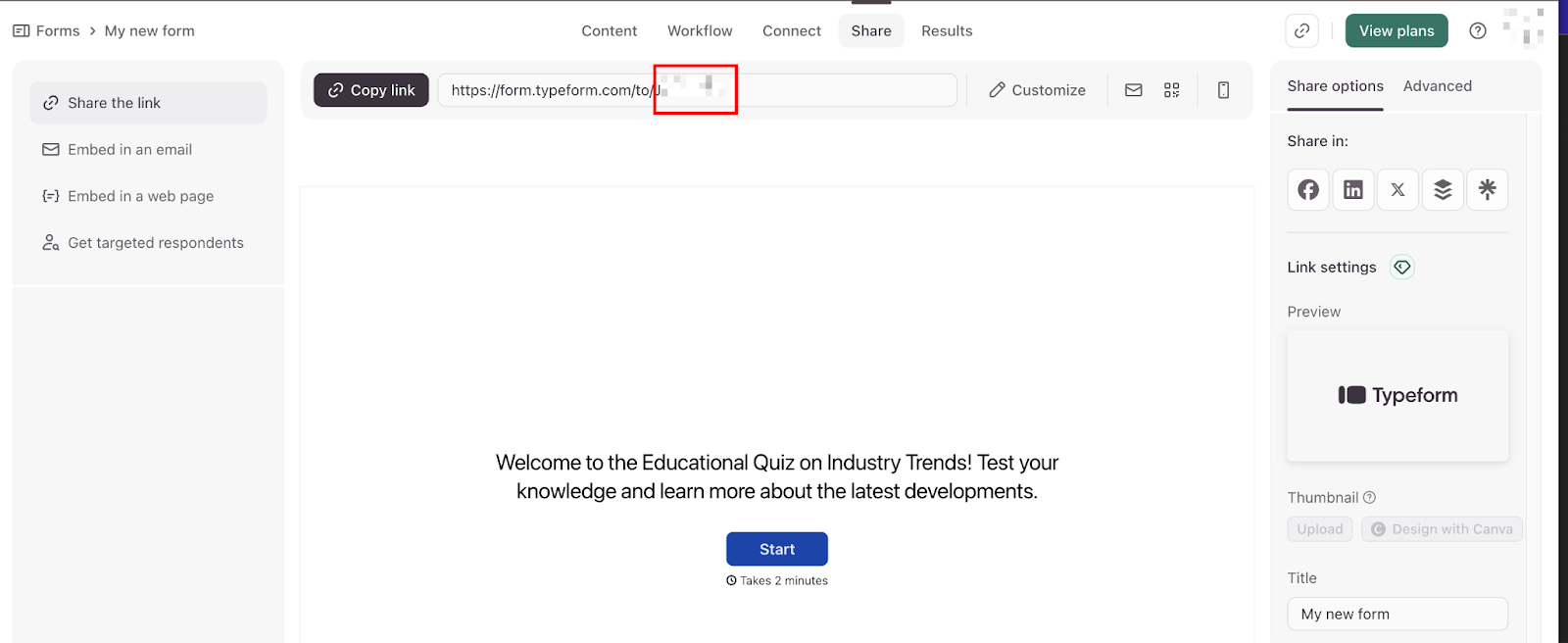 Open your Typeform, click Share in the top navigation, and select “Share the link” on the left panel of the dashboard.