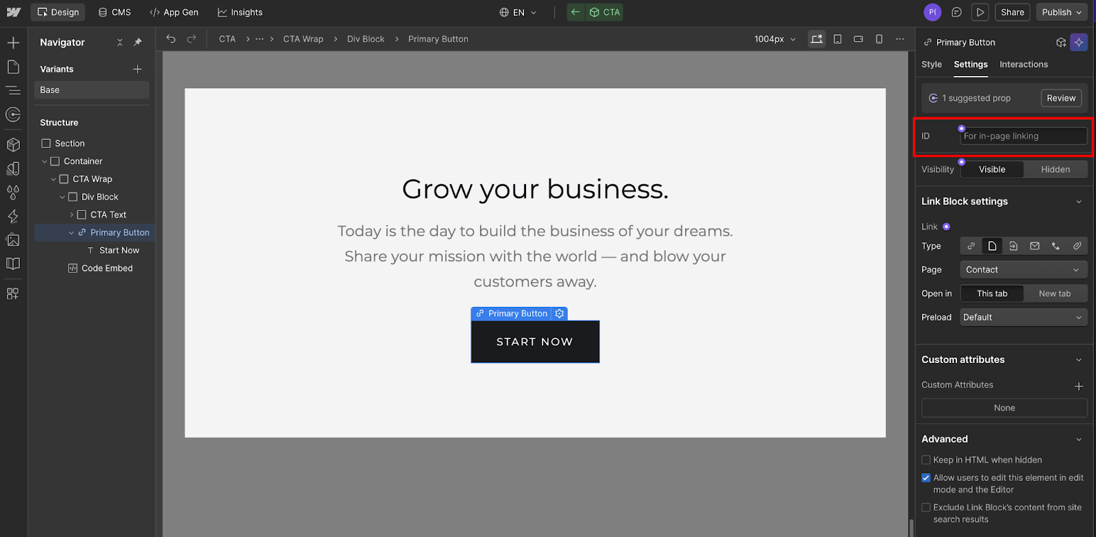 Step #2: Add a unique ID to your Webflow button