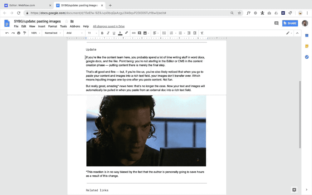 Content teams across the Webflow world, rejoice! Now when you paste words and images from a Google doc or other online writing tools into a rich text field, everything just works. Which saves writers time. And stress. And tears.