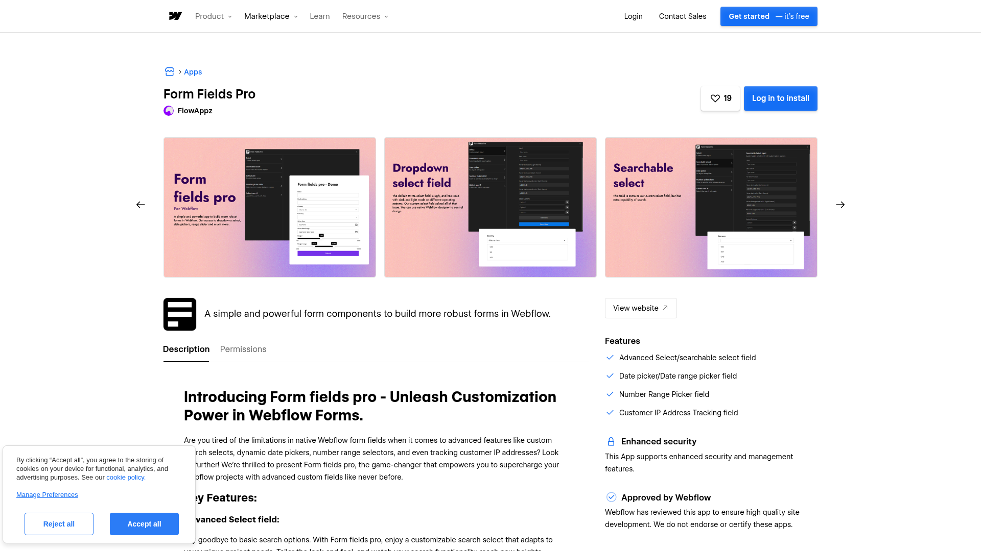 1. Visit the Form Fields Pro listing on the Webflow Apps Marketplace and click Log in to install
