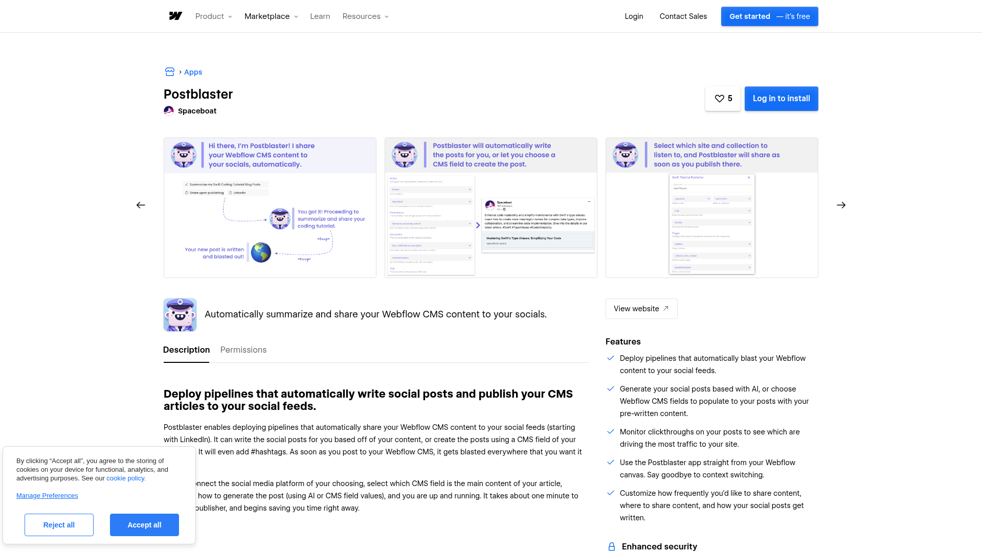 Postblaster is a backend service and adds no code or embeds to your site. Install it from the Webflow Apps Marketplace, authorize your Webflow account through OAuth, then open the Postblaster dashboard to configure your publisher pipelines. Select your CMS site and collection, connect your LinkedIn account, and deploy.