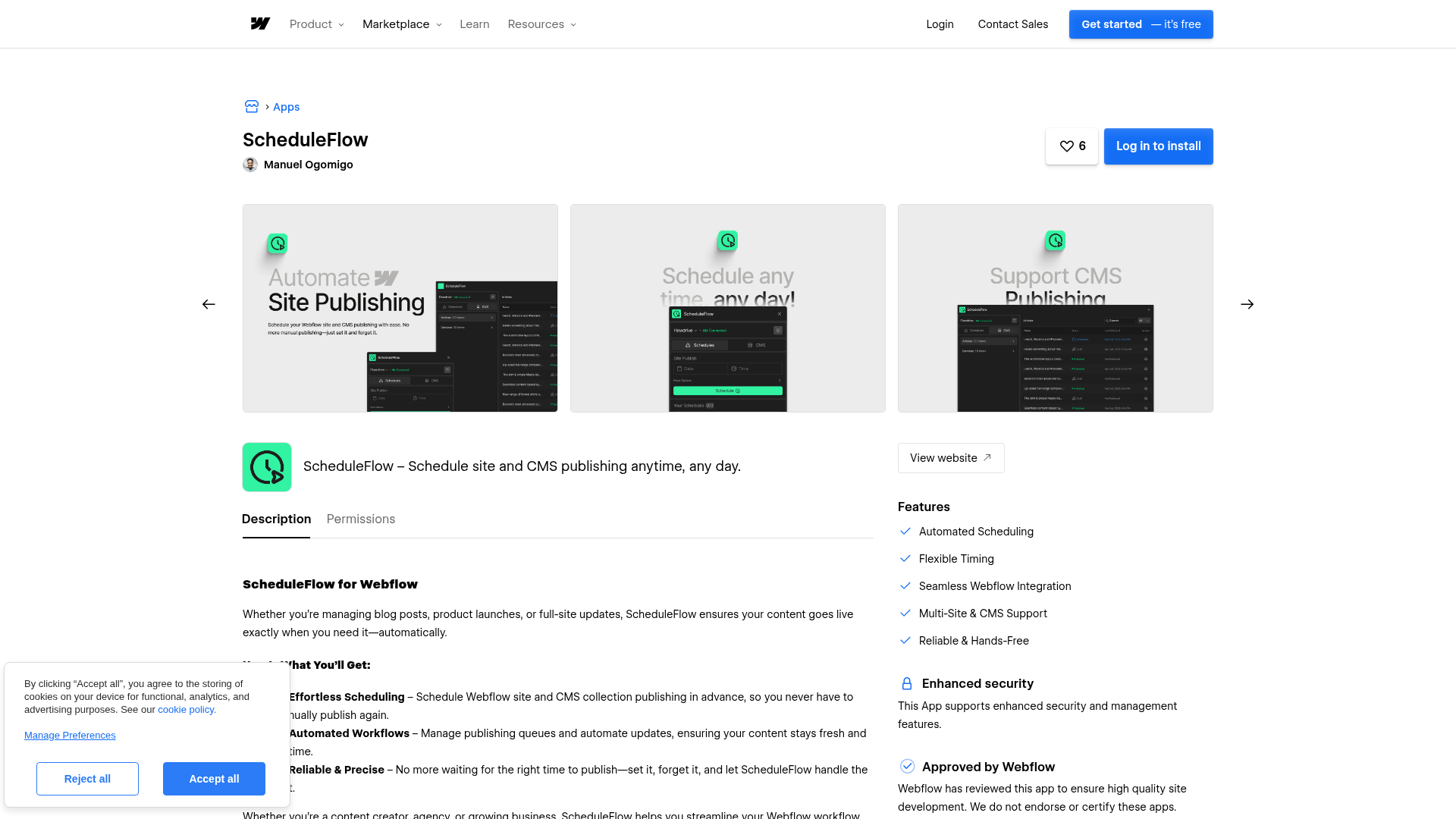 The ScheduleFlow app is listed in the Webflow Apps Marketplace with an "Approved by Webflow" designation and an "Enhanced Security" badge. Installing it connects your Webflow sites to ScheduleFlow's scheduling engine, which calls Webflow's publish endpoint at the times you configure. The app supports scheduling for both full-site publishes and CMS item publishing across multiple sites. The developer describes the setup as "Connect Sites → Schedule Site or CMS → Relax."