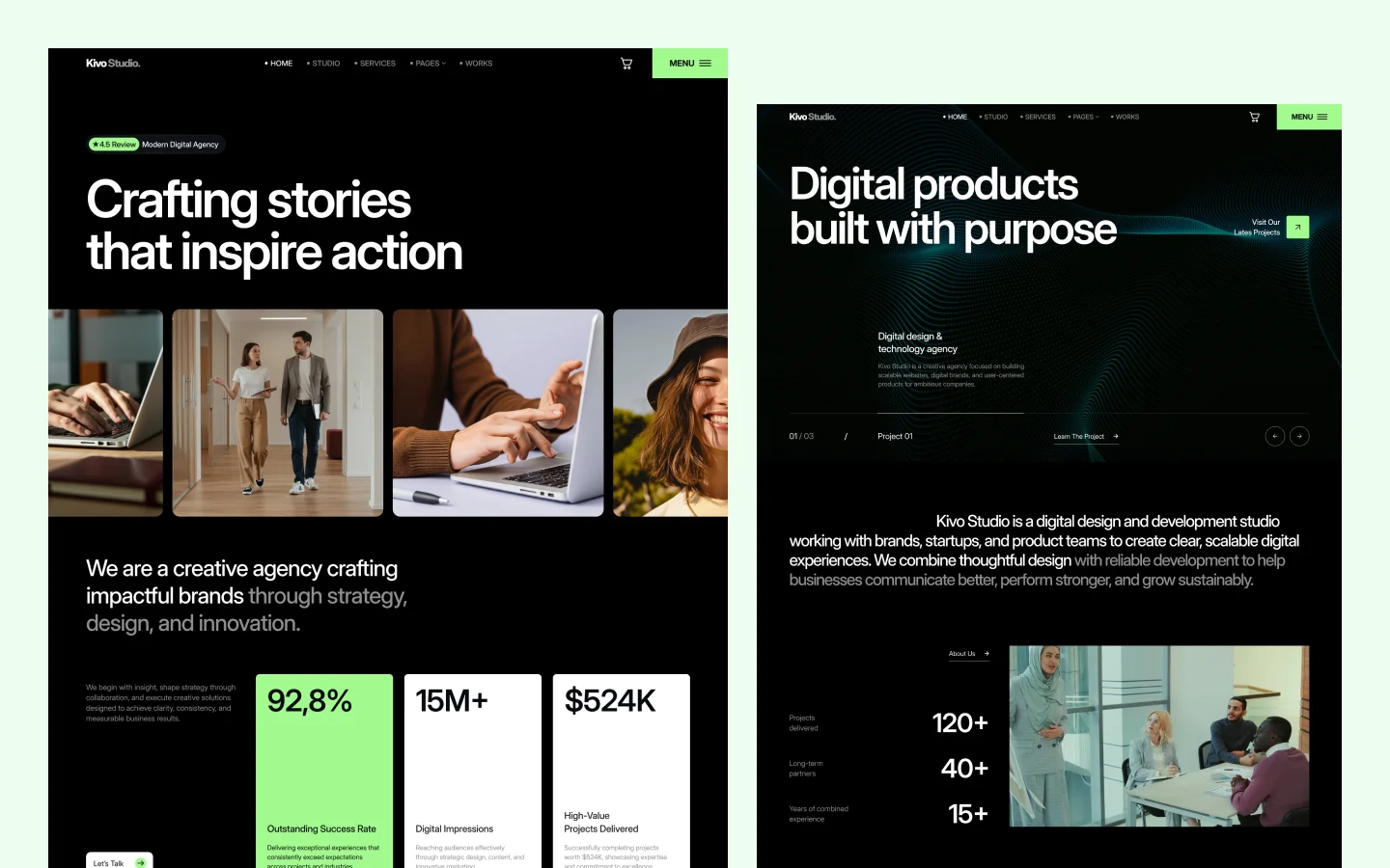 Kivo Studio is a multi-layout Webflow template built for agencies, marketing teams, and portfolio-focused studios. Featuring clean visuals, CMS-powered pages, and smooth interactions, it’s ideal for creating high-impact flexible, & professional Site.