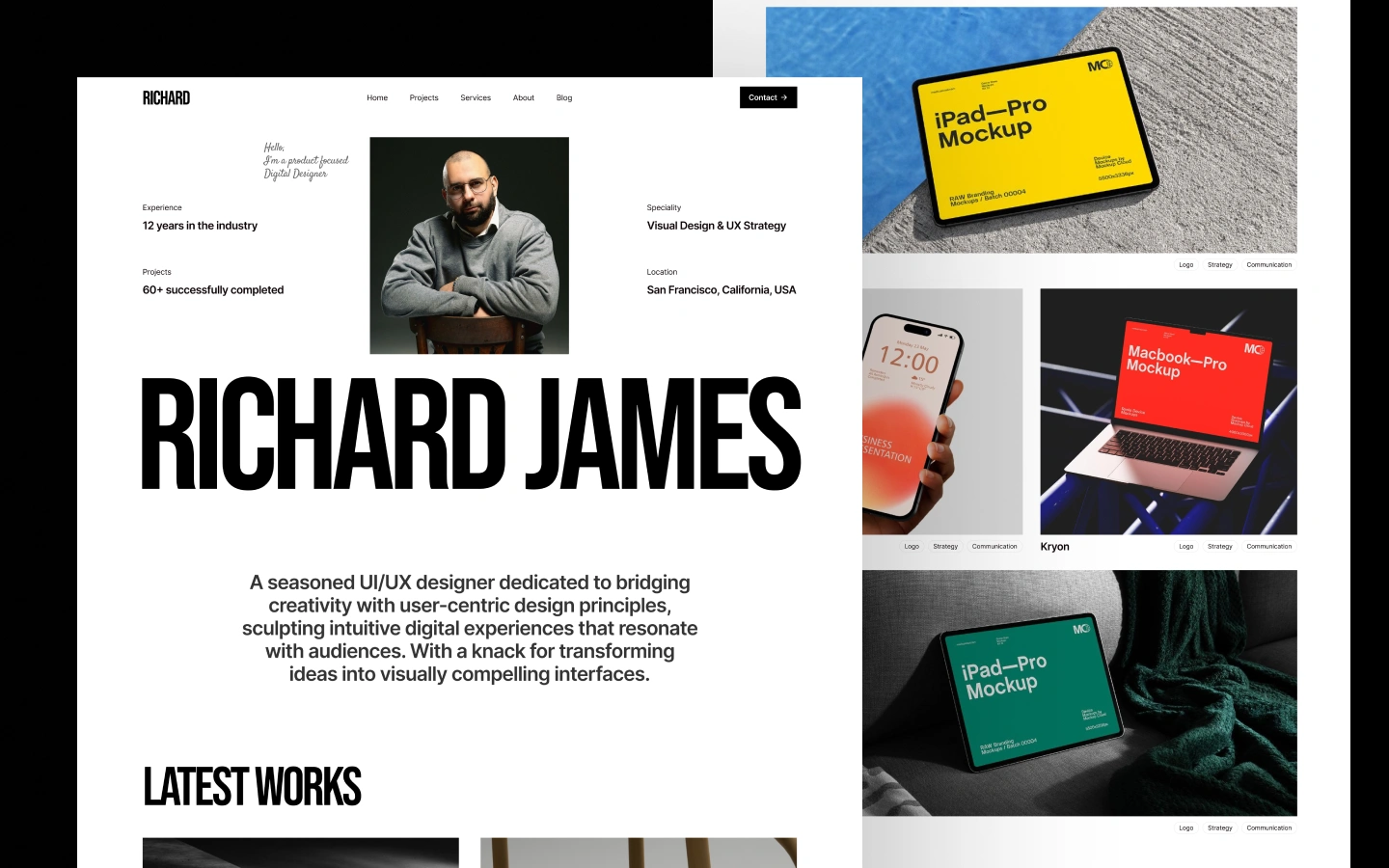 Meet Richard - A polished and elegant Webflow portfolio website template. This template, which is perfect for designers, developers, photographers, and other creatives, elegantly and simply displays your work.