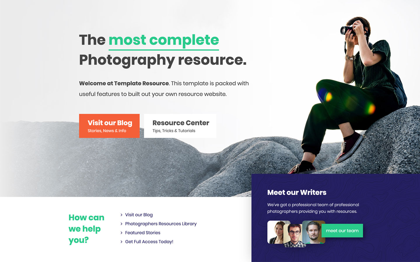 The perfect template to present any resources. The template focuses on the subject of Photography but can be transformed into any resource-type, featuring your content, categories, etc. Easily customize colors, fonts, and images to fit your business.
