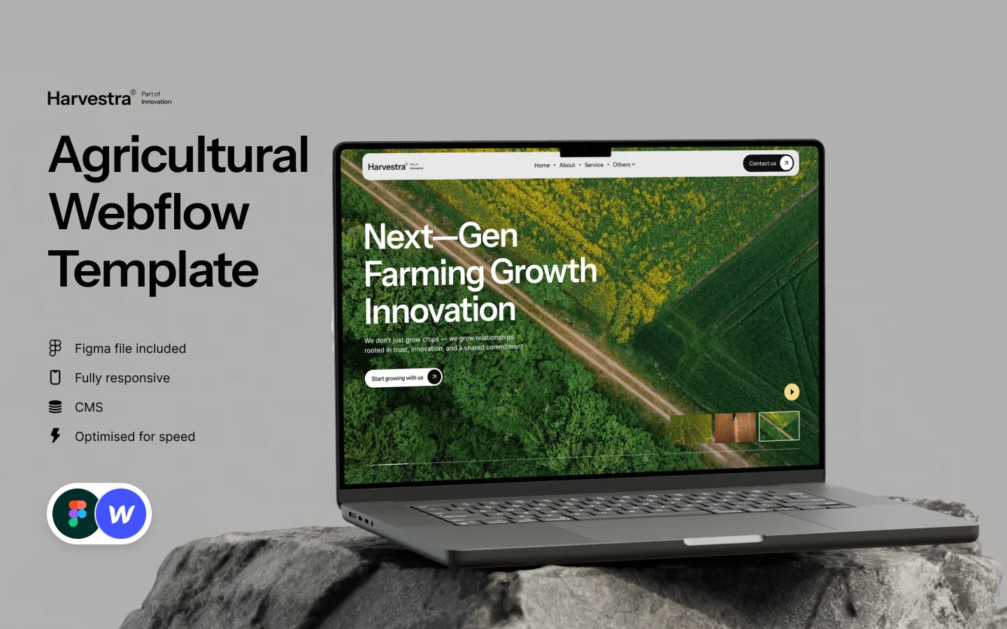 Harvestra is a minimal and professional Webflow template for Agriculture based websites, crafted with a unique design and smooth animations. Featuring an organized CMS for services and blogs, you can easily launch your new website.
