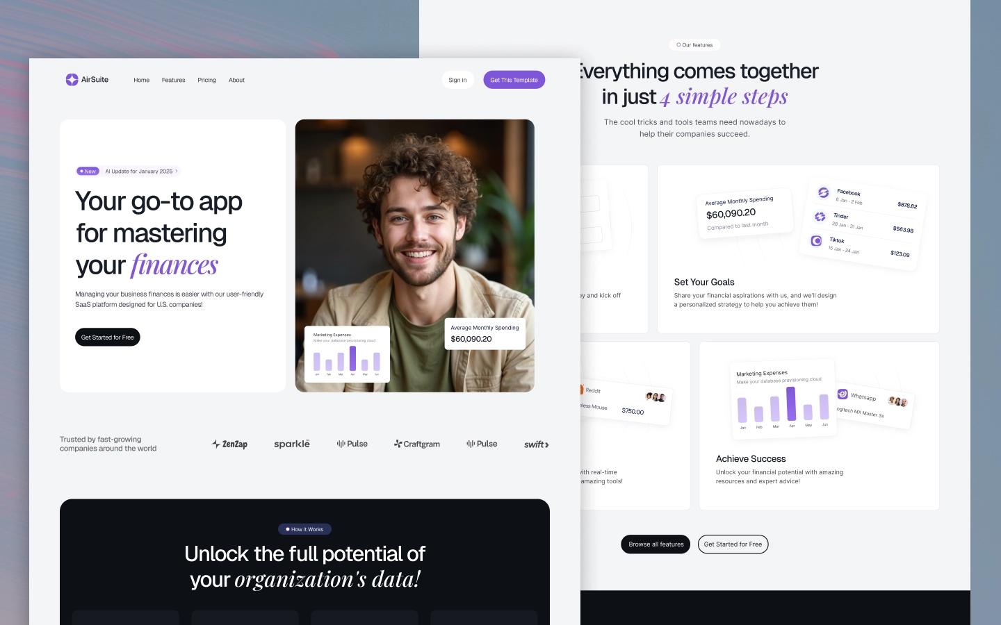 AirSuite is perfect for startups and SaaS companies in the finance space. With its clean design and marketing-focused structure, this template helps you launch quickly, connect with your audience, and grow your business.