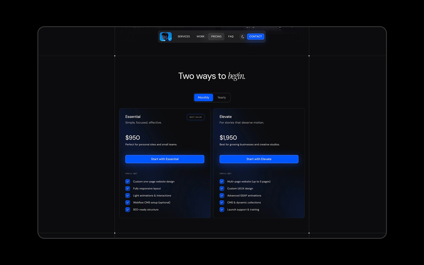 Aluro is a dark one-page Webflow portfolio built for professionals, freelancers, and studios. Clean type, subtle motion, responsive & CMS-ready.
