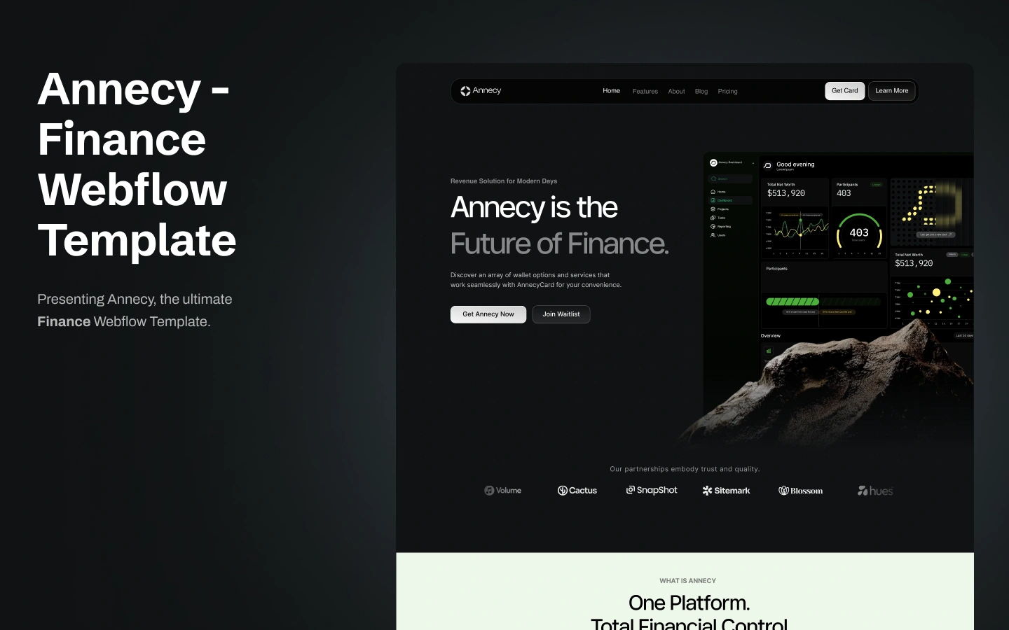 Annecy is a modern Webflow Finance template built for startups, SaaS products, and small software agencies looking to launch a professional online presence quickly. With captivating dashboard sections, strong visuals, and a clean layout, this premium Webflow template helps present your product with clarity and impact.