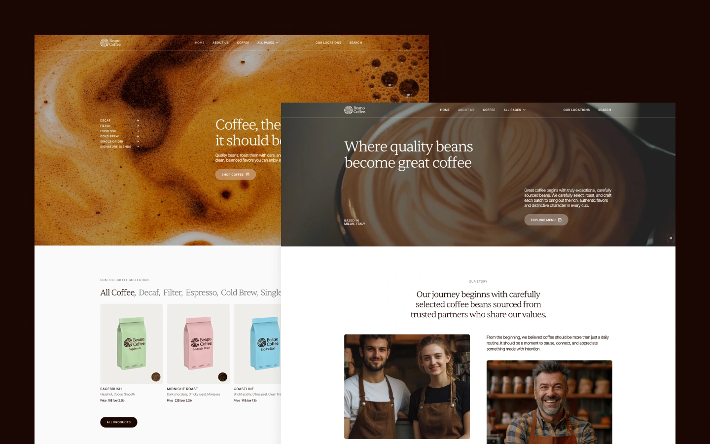 Beano is a coffee roastery website template for specialty coffee, artisan roasting, small batch beans, espresso, cafe, barista, coffee shop, organic and fair trade coffee, single origin beans, coffee brewing, subscription, and online coffee sales.