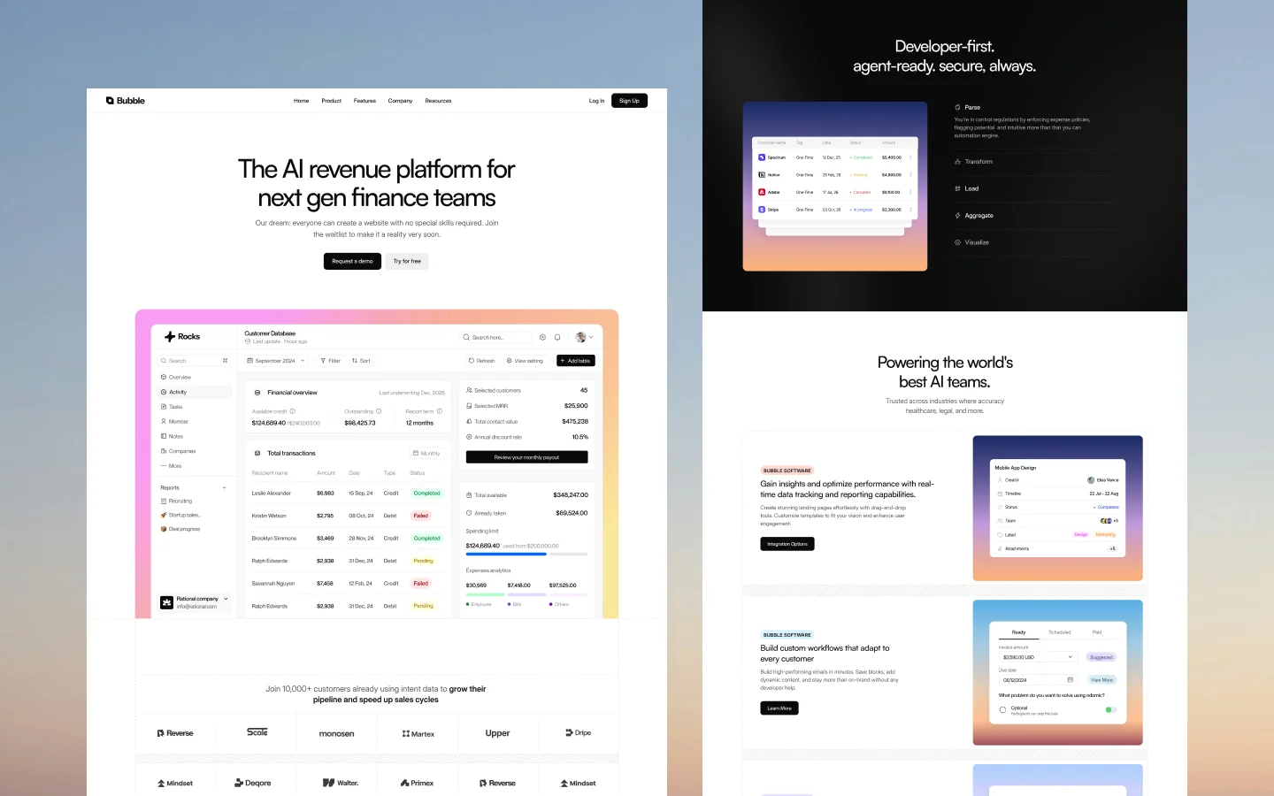 Bubble is a premium Webflow template tailored for AI revenue platforms, fintech startups, and B2B SaaS. Featuring stunning gradient aesthetics and complex dashboard mockups, Bubble helps you showcase financial tools and convert enterprise leads.
