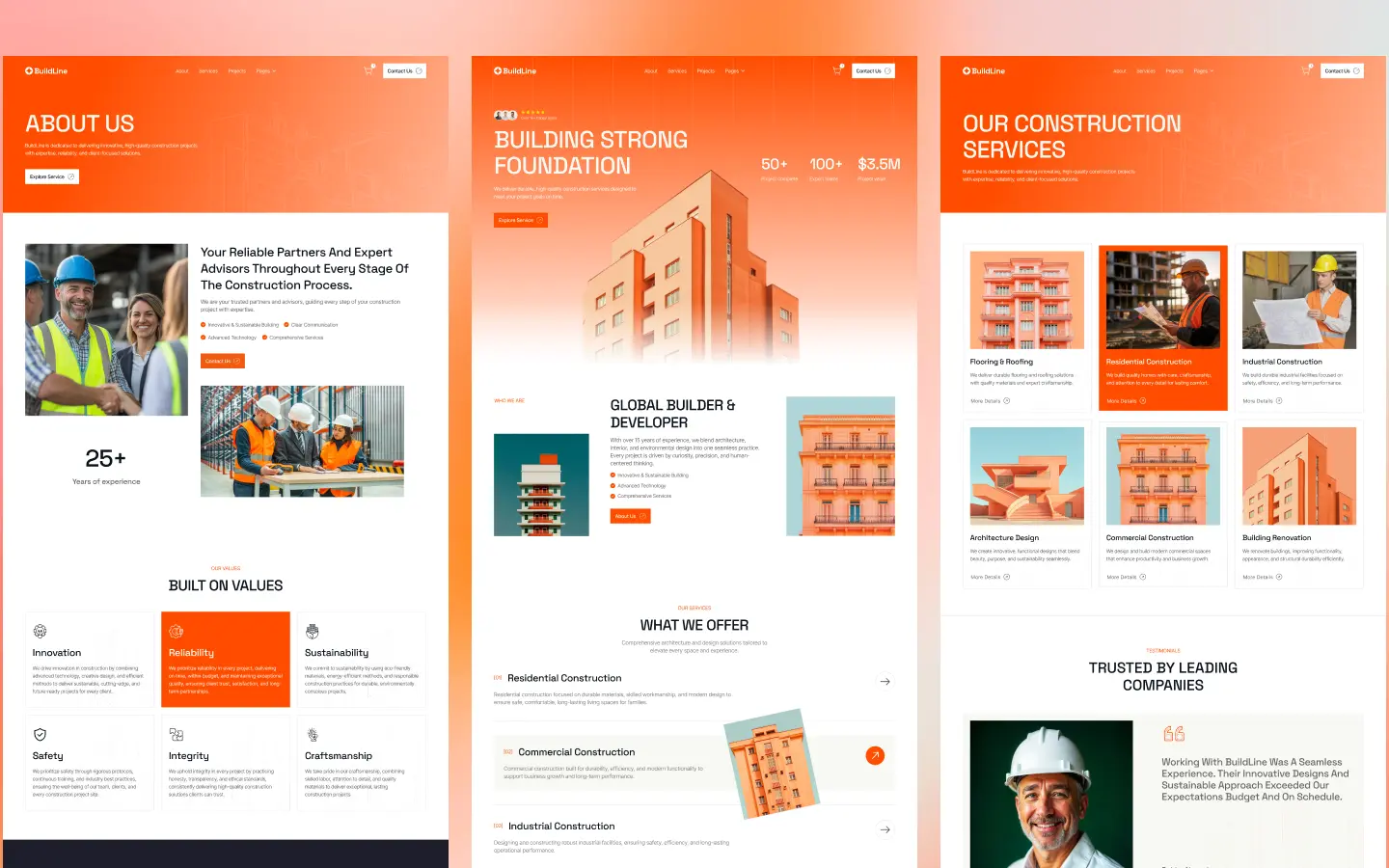With its bold typography, structured layout, and vibrant visual style, BuildLine helps construction businesses clearly communicate services, highlight completed projects, and build trust with potential clients.