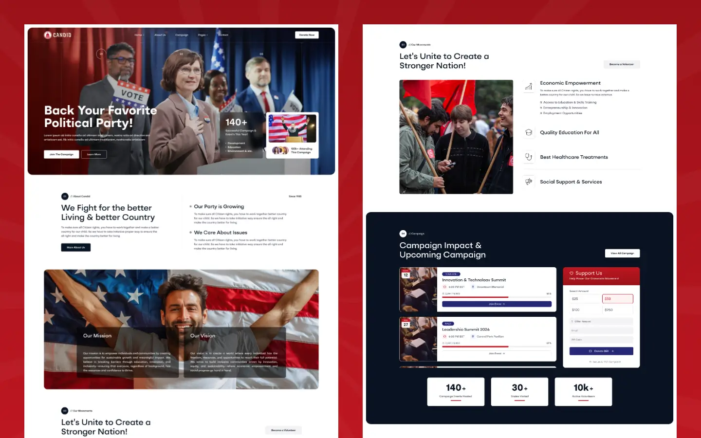 Every page is optimized to convert visitors into active supporters. The fundraising website template includes donation forms that work smoothly. You get a complete political website design without hiring expensive developers.