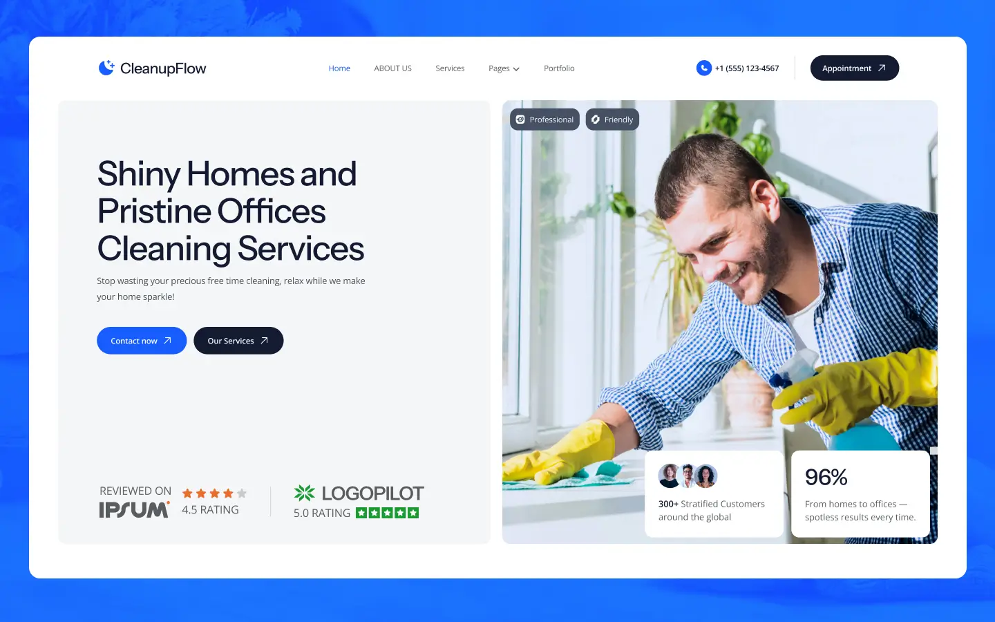 CleanupFlow Webflow template suits cleaning service, home sanitization, industrial hygiene, janitorial, maid & housekeeping, carpet cleaning, laundry, pool maintenance, eco-friendly cleaning, deep & residential cleaning, window washing websites.