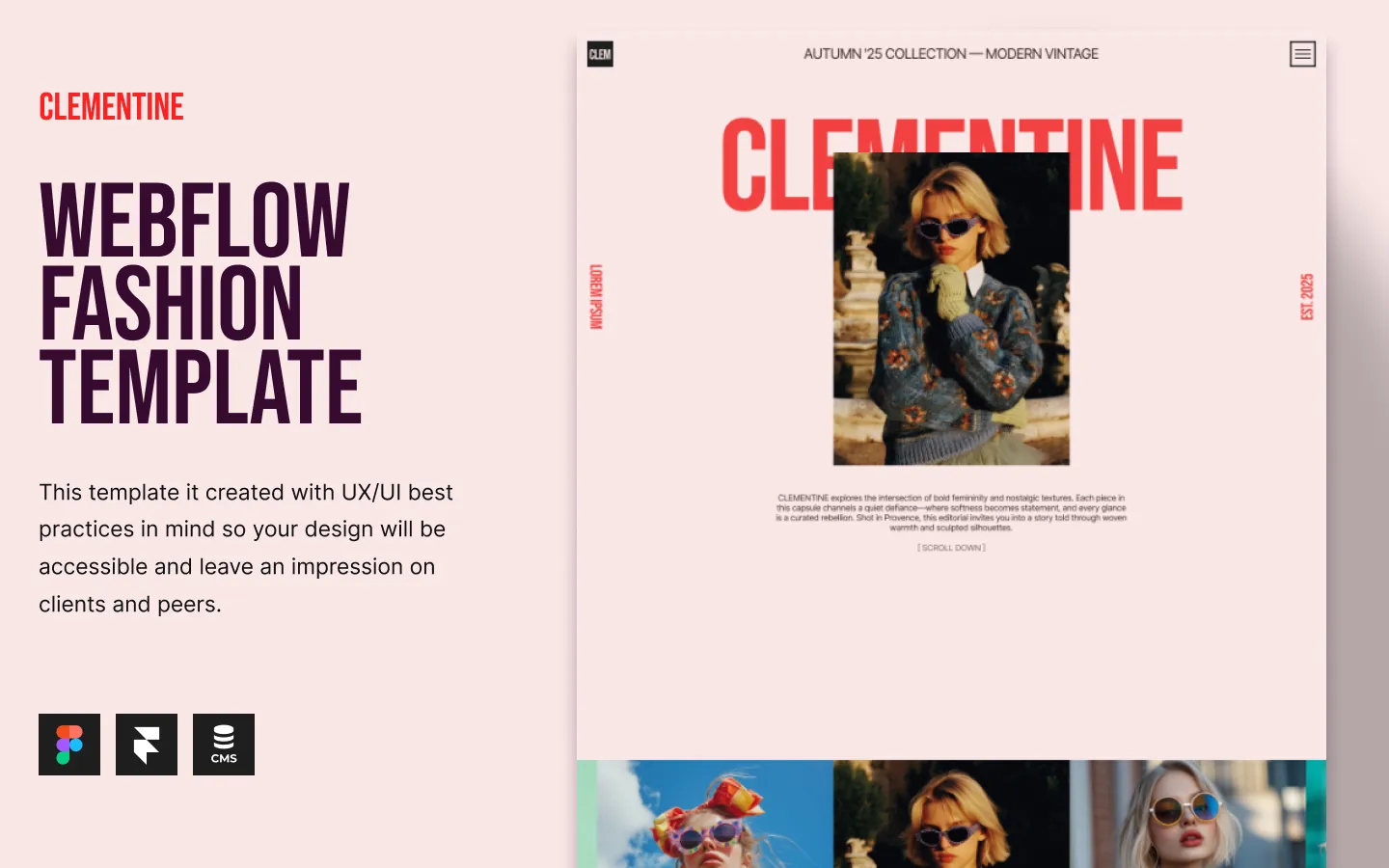 CLEMENTINE is a bold, light, and minimal Webflow template designed for fashion brands, photography portfolios, and editorial websites. Built with a clean grid system, strong typography, and generous white space, it creates a refined visual experience that highlights imagery and storytelling.