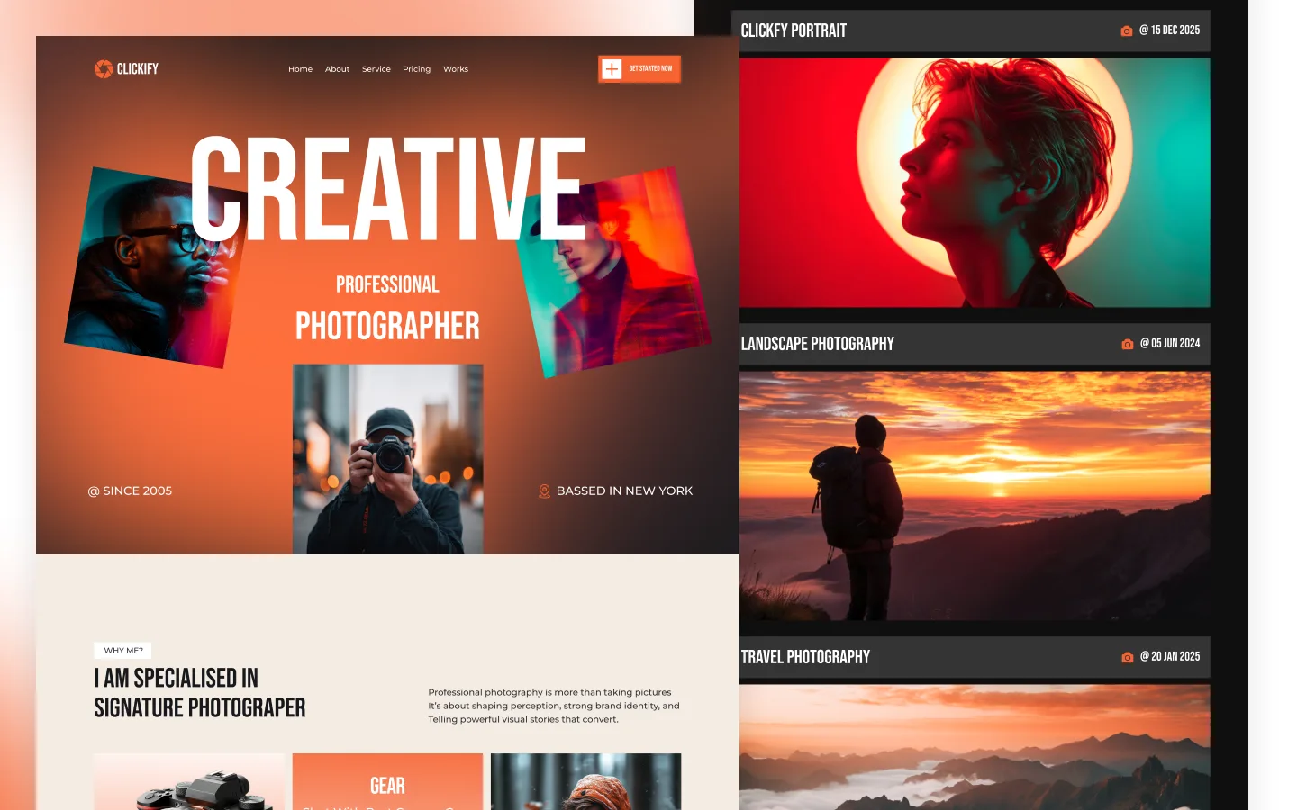 Designed with photographers in mind, Clickify is where elegance meets edge, where minimalist layouts deliver maximum visual impact. Every scroll, every interaction, every detail is carefully crafted to place your artistry at center stage.