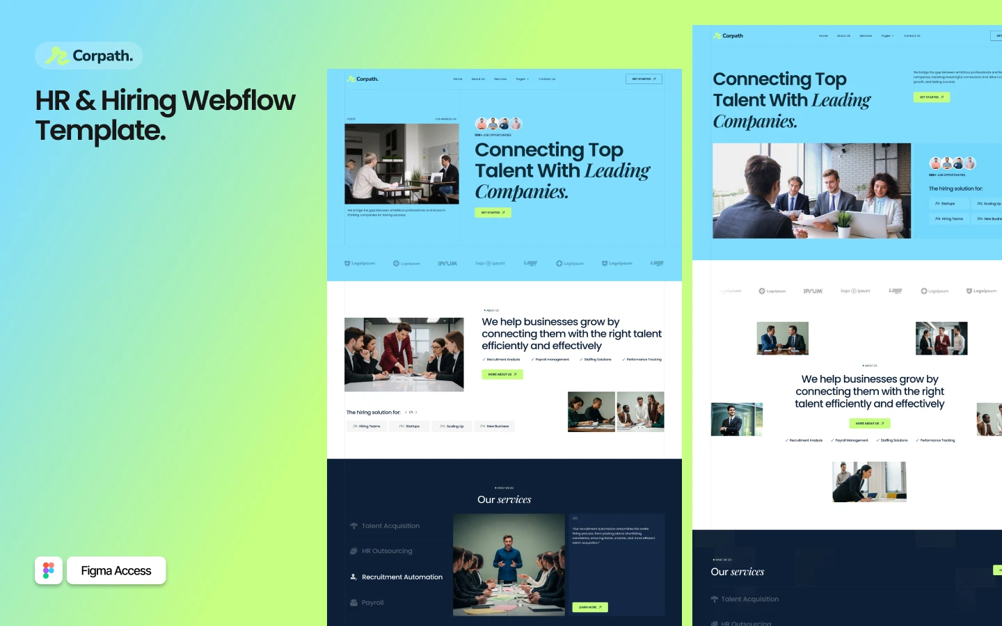Corpath is a premium Webflow template for HR, recruitment, and staffing agencies. Its sleek, professional design highlights services, builds trust, and converts visitors—delivering speed and seamless performance.