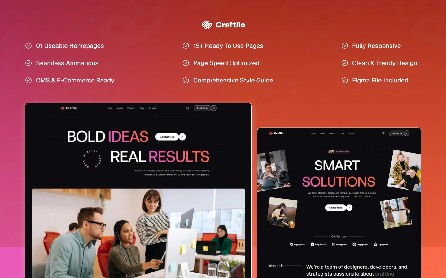 Designed by Ninetyflow, Craftlio features smooth animations, a clean aesthetic, and flexible layouts that adapt beautifully across all devices. Whether you’re launching a new agency, rebranding your studio, or building a personal portfolio, Craftlio gives you everything you need to craft a professional online presence.