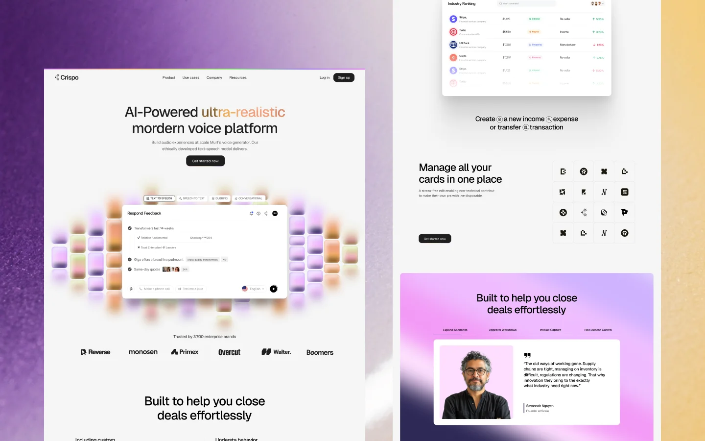 AI-first visual language: Crispo uses soft gradients, floating tiles, and expressive visual cues built specifically for AI, voice, and audio-tech products.