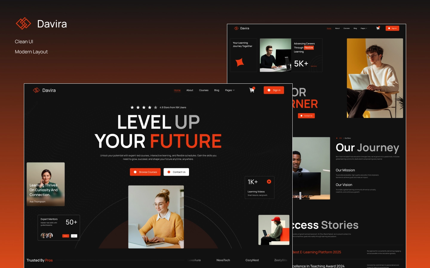 Davira is crafted for learning platforms that value clarity, engagement, and educational impact. Its design prioritizes both learner experience and conversion potential, helping you present courses, mentors, and outcomes professionally and confidently.