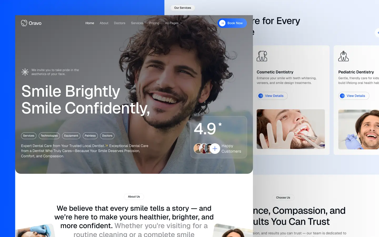 Oravo is a clean, modern template built specifically for dental clinics and professional dentists. It’s crafted to highlight your dental services, showcase medical expertise, and present your dental clinic with a polished, trustworthy look.