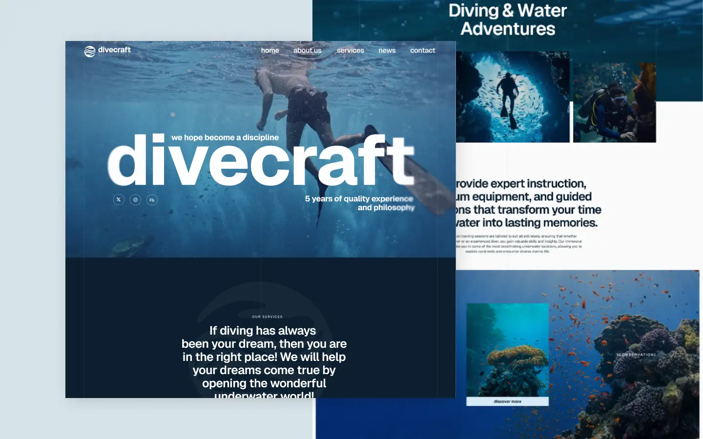 Divecraft is a Webflow template that can be used for scuba diving, scuba diving website, scuba diving template, scuba diving webflow template, dive center, dive shop, diving school, diving courses, diving certification, PADI diving, underwater adventure, snorkeling, freediving, water sports, water sports website, water sports template, ocean activities, marine sports, underwater exploration, dive tours, diving trips, dive equipment, dive gear rental, coral reef diving, wreck diving, adventure sports website, coastal activities, sea sports, aquatic sports, extreme water sports, travel and adventure website websites.