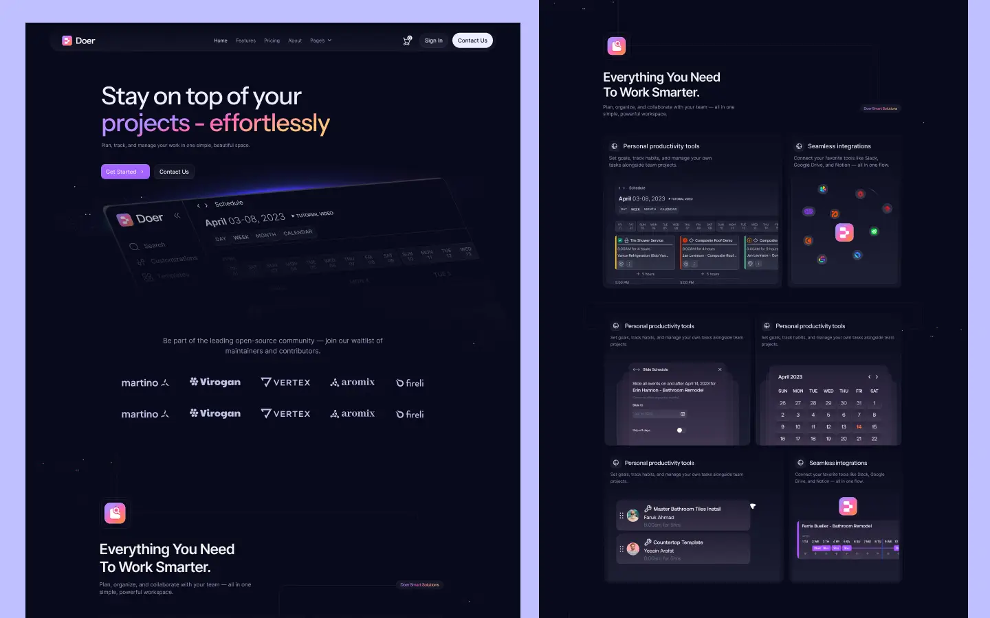 Designed for teams who want to launch quickly without compromising quality, Doer AI includes modern dashboards, pricing pages, feature sections, blog layouts, documentation, and fully customizable CMS collections.