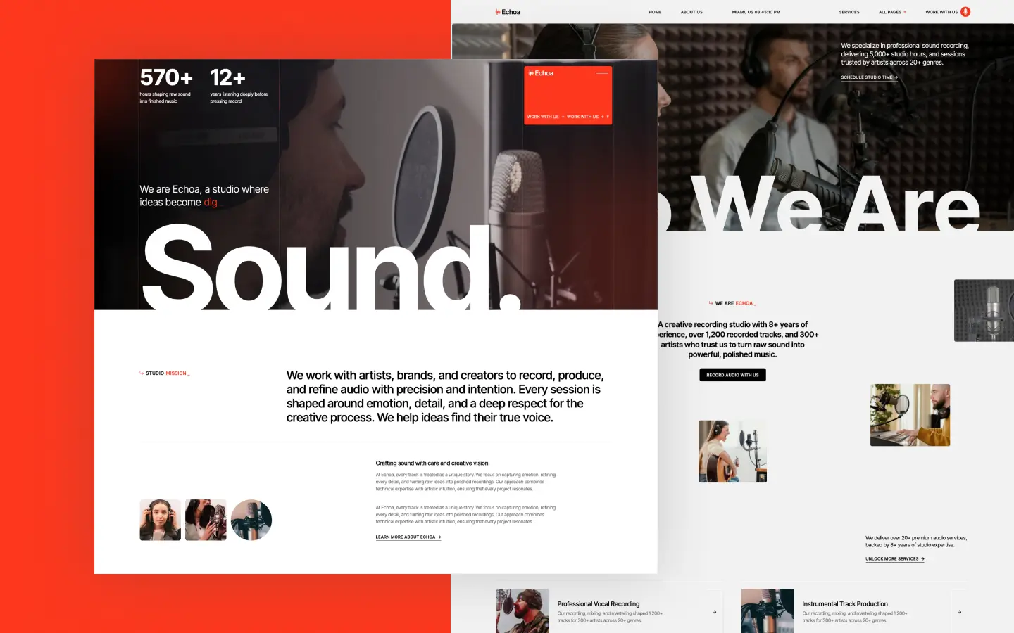 Echoa is a Webflow template that can be used for audio recording, video recording, sound studio, music production, record label, voice-over, audio editing, audio mixing, mastering, podcast production, podcast creation, music services, music composition, sound design, music engineering, recording session, vocal recording, instrument recording, music arrangement, studio booking, live recording, digital audio, audio production, sound engineering, audio post-production, music recording, mixing studio, audio mastering, music mixing, sound tracking, audio post, voice recording, music collaboration, music project, audio workflow, sound production, music recording services, professional recording, recording session management, audio interface setup, studio monitoring, music studio equipment websites.